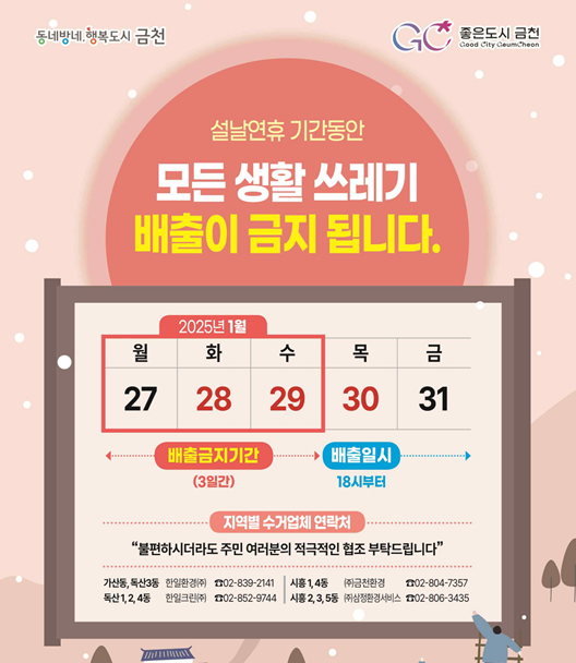 2025년 설날 연휴기간 생활쓰레기 배출 안내입니다.