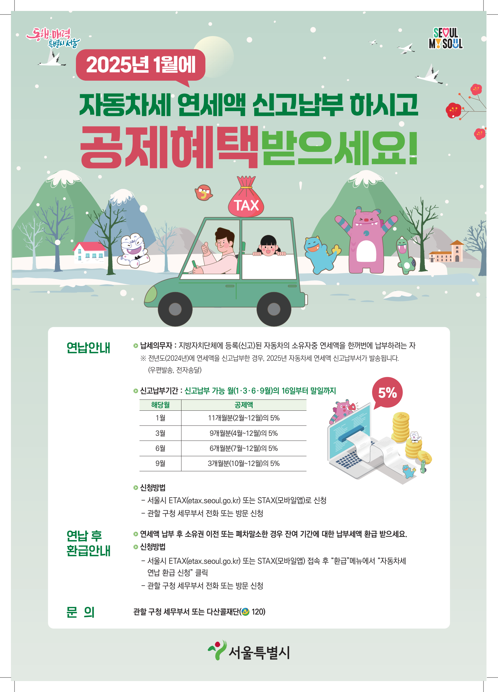 - 인터넷 납부: http://etax.seoul.go.kr에서 계좌이체 또는 신용카드 납부