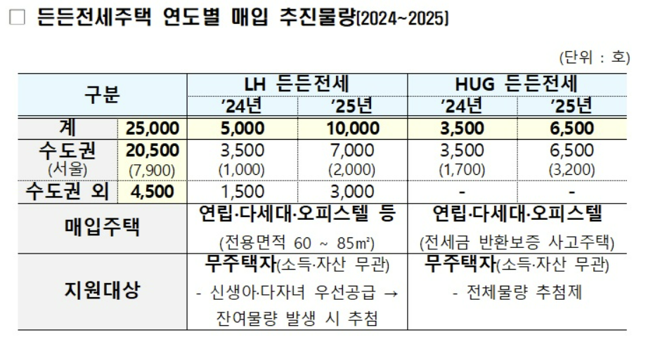 LH 든든전세주택은 3∼4인 가구가 쾌적하게 생활할 수 있도록 전용면적 60~85㎡의 신축 주택을 1만 5000가구를 매입하고, HUG 든든전세주택은 집주인 대신 전세금을 돌려주고 경매 신청한 주택을 HUG가 직접 낙찰받아 1만가구를 매입한다.