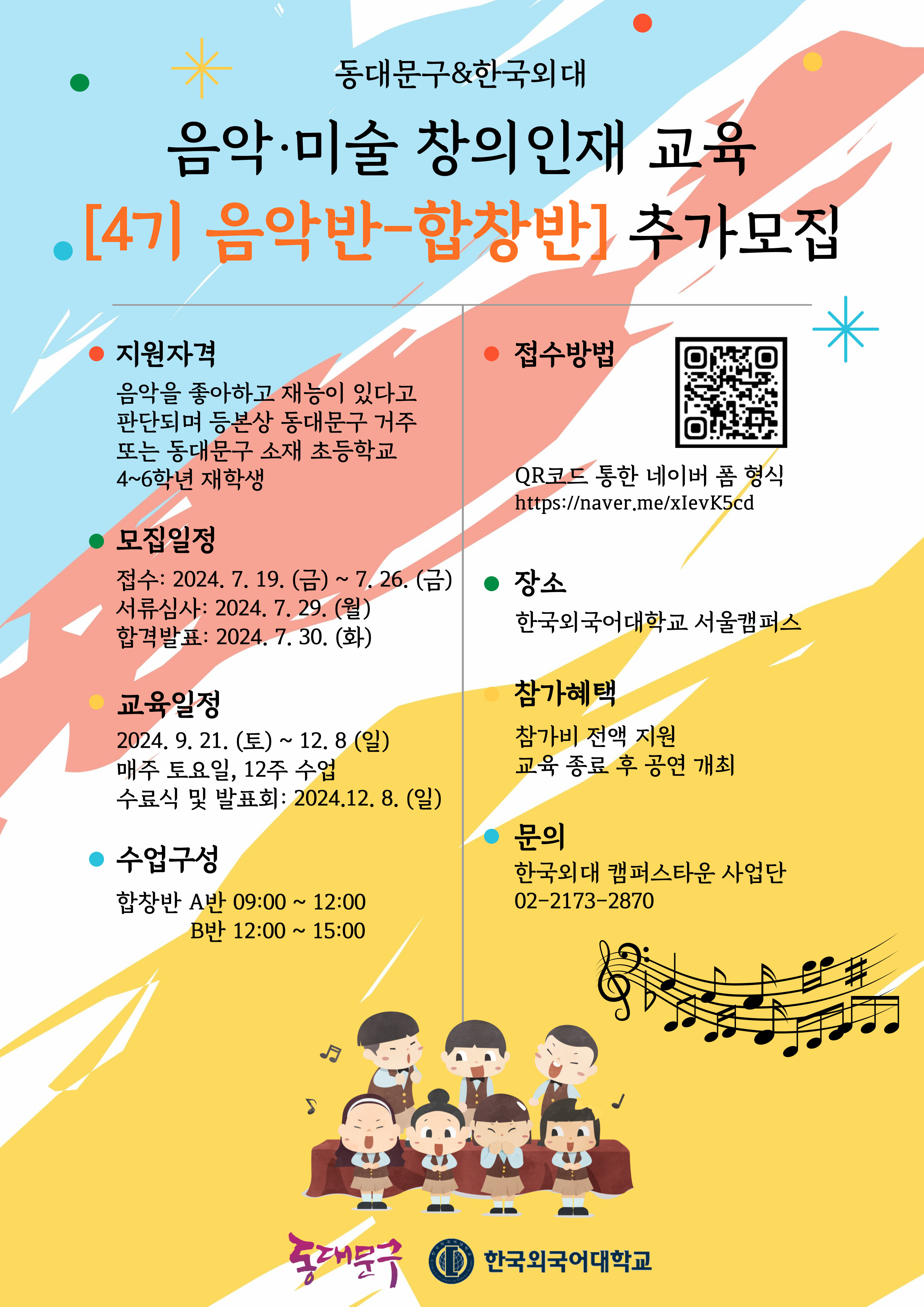 동대문구&한국외대가 음악에 관심과 재능이 있는 초등학교 4~6학년 학생을 대상으로 창의인재 양성교육 4기(음악) 합창반 추가 모집을 실시합니다. 동대문구 지역 초등학생들의 많은 지원 바랍니다. ※수업료 전액 무료(동대문구 지원)
