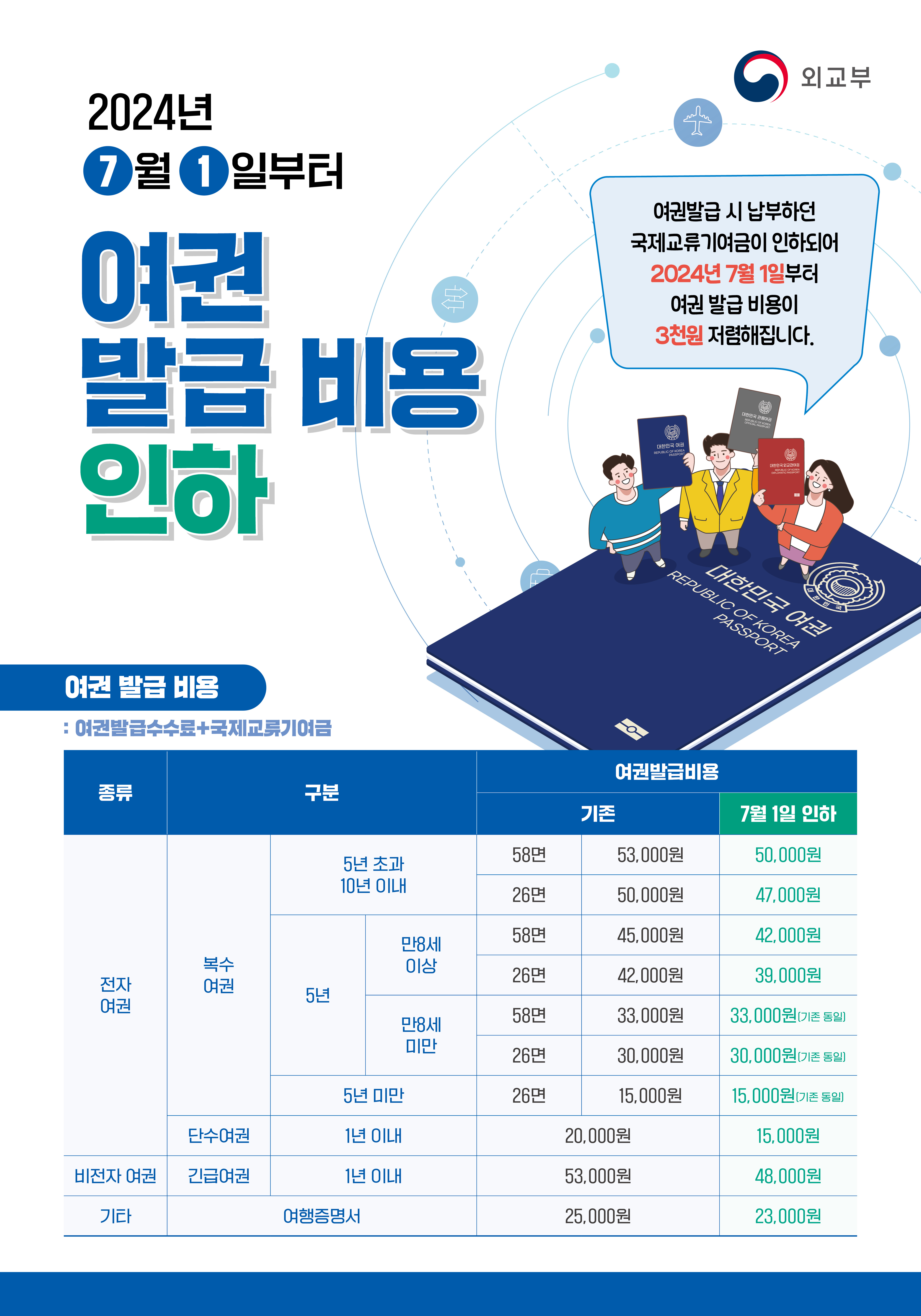 2024년 7월 1일(월)부터 여권발급 비용(복수여권은 3천원 인하, 단수여권과 여행증명서는 면제)이 인하