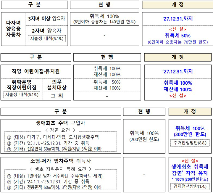 특히 이번 개정안은 2자녀 가구에 대한 세제지원 신설, 생애최초 주택 취득세 감면확대 등을 통해 저출생 문제를 해결하고 민생부담을 경감하는 한편, 장애인·국가유공자 등 사회적 취약계층을 지원하는 내용을 담고 있다.